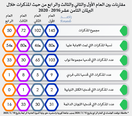 وبخصوص المذكرات النيابية فقد قدم المجلس الثامن عشر 369 مذكرة نيابية أجيب على 59% منها، حيث توزعت المذكرات حسب تقديمها: عدد المذكرات التي قدمها مجموعة نواب إلى 231، وعدد المذكرات التي قدمها نائب فردي إلى 23 مذكرة، وقدمت اللجان النيابية 110 مذكرة، إضافة إلى تقديم الكتل البرلمانية لـ 5 مذكرات، وبمقارنة المذكرات التي تم تقديمها في المجلس السابع عشر فقد وصلت إلى 549 مذكرة نيابية، توزعت على 289 مذكرة قدمها مجموعة نواب، و90 مذكرة قدمها نواب أفراد ومذكرة واحدة قدمتها كتلة نيابية، بينما قدمت اللجان 169 مذكرة نيابية.
