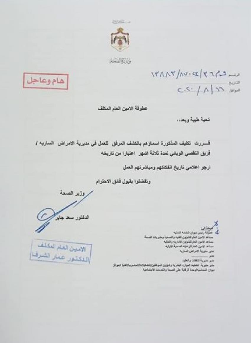 وقال جابر، في تعميم له، إنه قرر تكليف عدد من العاملين في فرق التقصي الوبائي لمدة 3 اشهر.