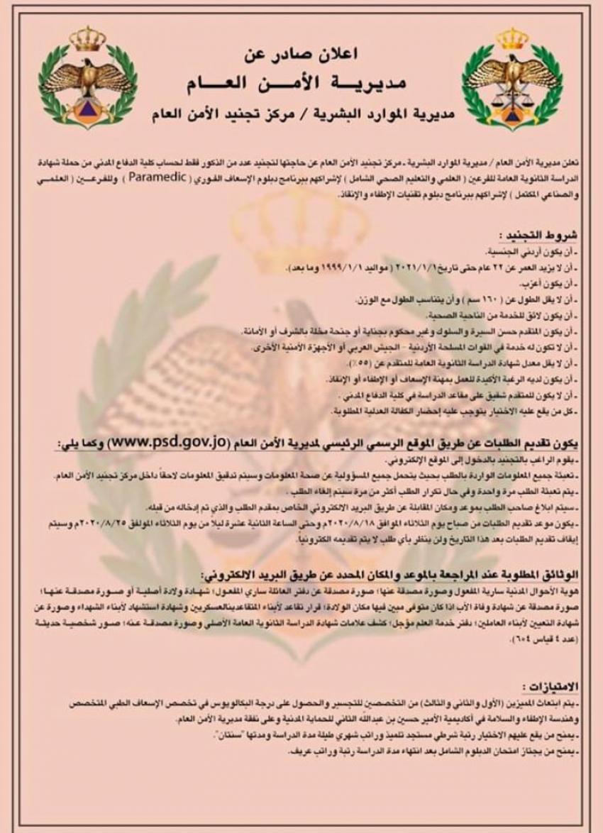 أحداث اليوم - أعلنت مديرية الأمن العام مديرية الموارد البشرية / مركز تجنيد الأمن العام عن رغبتها بتجنيد عدد من الذكور لحساب كلية الدفاع المدني.وتالياً الشروط: