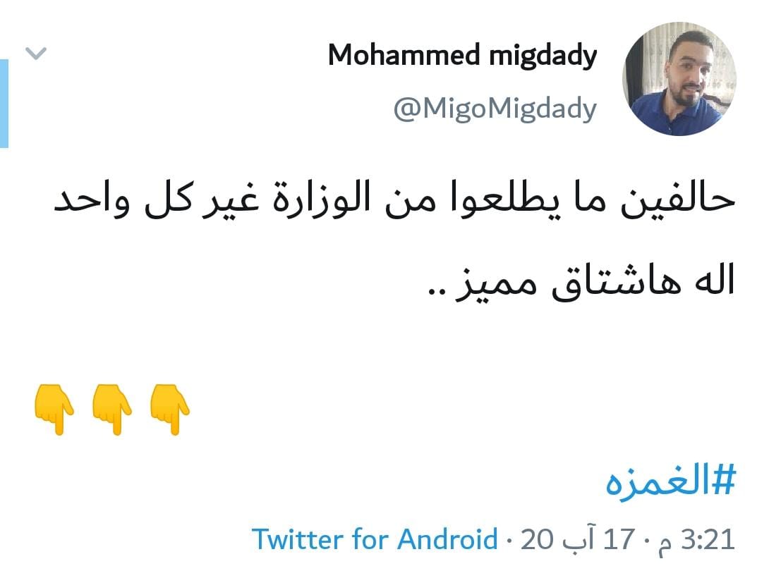 وكتب حذيفة المقداد، "أهم شي الغمزة. قلبي الصغير لا يتحمل. أتحداكم إذا وزيركم بغمزكم زي وزيرنا. احنا غير...