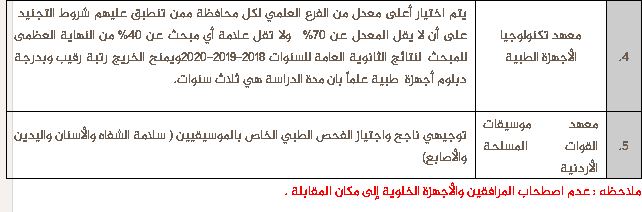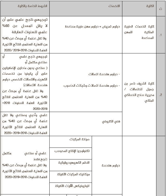 (1) الثانوية العامة للسنوات السابقة معدل(50%) فأعلى ناجح شرط أن لا تقل العلامة في أي مبحث عن (40) % باستثناء كلية الخدمات الطبية الملكية للمهن المساعدة ومعهد تكنولوجيا الأجهزة الطبية ضمن شروط خاصة .