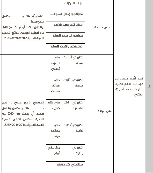 أحداث اليوم - اعلانت القيادة العامة للقوات المسلحة الأردنية – الجيش العربي مديرية شؤون الأفراد عن حاجتها لتجنيد عدد من الذكور من حملة شهادة الدراسة الثانوية العامة ( ناجح ) وذلك لحساب كليات المجتمع ضمن برنامج الدبلوم الشامل والبرنامج الفني وبشروط معينة لهذا العام 2020.