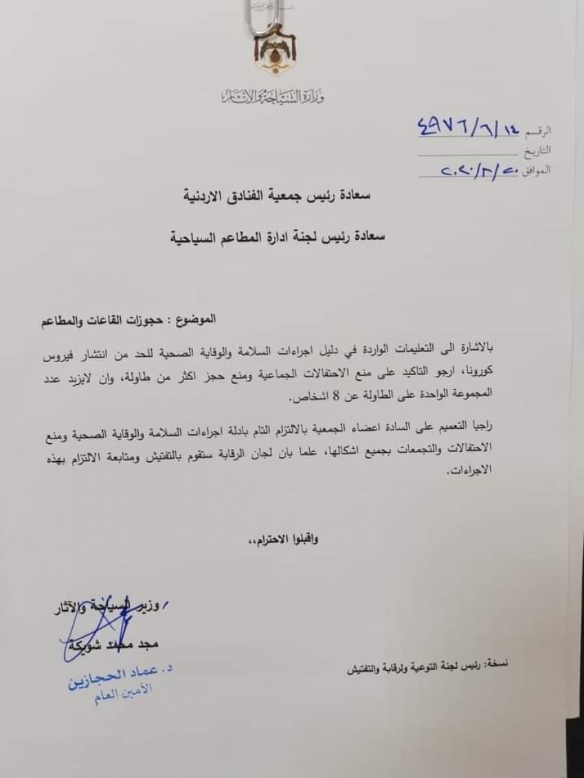 أحداث اليوم - عممت وزارة السياحة والآثار بكتاب وجهته الى جمعية الفنادق، وجمعية المطاعم السياحية الخميس، بمنع الاحتفالات الجماعية ومنع حجز أكثر من طاولة، وعلى ان لا يزيد عدد المجموعة الواحدة على الطاولة عن 8 أشخاص، وذلك بحسب التعليمات الواردة في دليل اجراءات السلامة والوقاية الصحية للحد من انتشار فيروس کورونا.