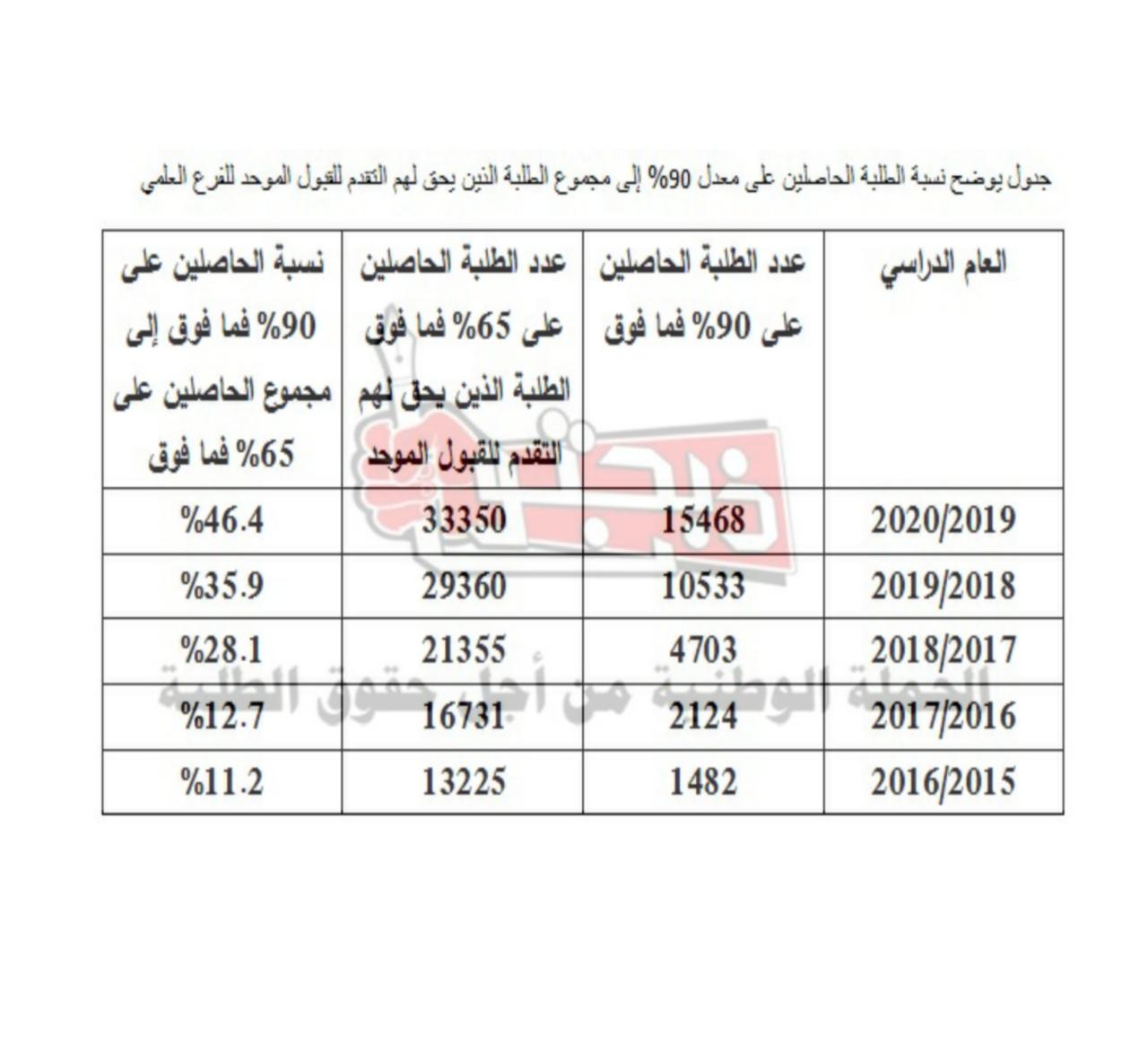 ويظهر الجدول أن ما يقارب نصف عدد الطلبة الذين يحق لهم التقدم للقبول الموحد (معدل 65% فما فوق) تبلغ معدلاتهم 90% فما فوق. وهو الأمر الذي يعتبر الخلل الأكبر في نتائج امتحان الثانوية العامة.