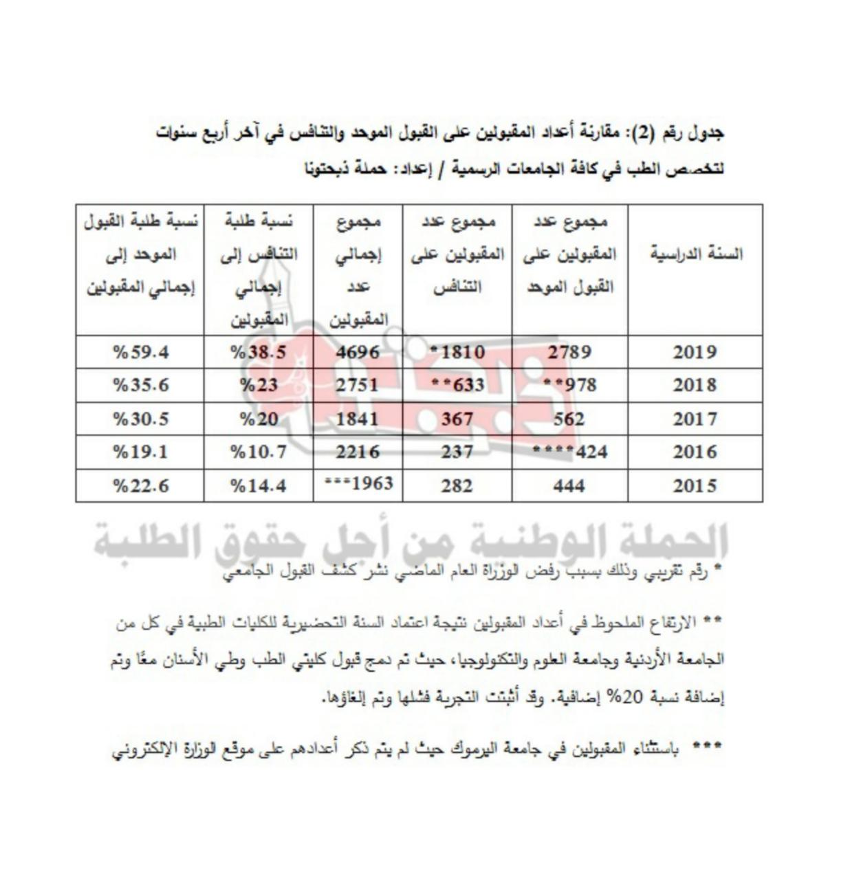 ويشير الجدول رقم (2) أدناه إلى أن عدد المقبولين على القبول الموحد في كليات الطب للعام الماضي بلغ 2789 طالب وطالبة، فيما لم يتجاوز العدد الـ987 طالب وطالبة في العام 2018 علمًا بأنها تعتبر أرقم مرتفعة كونه تم اعتماد السنة التحضيرية، أما في عام 2017، فإن عدد المقبولين في كليات الطب 562 طالب وطالبة، وفي عام 2016 بلغ العدد 424 طالب وطالبة.