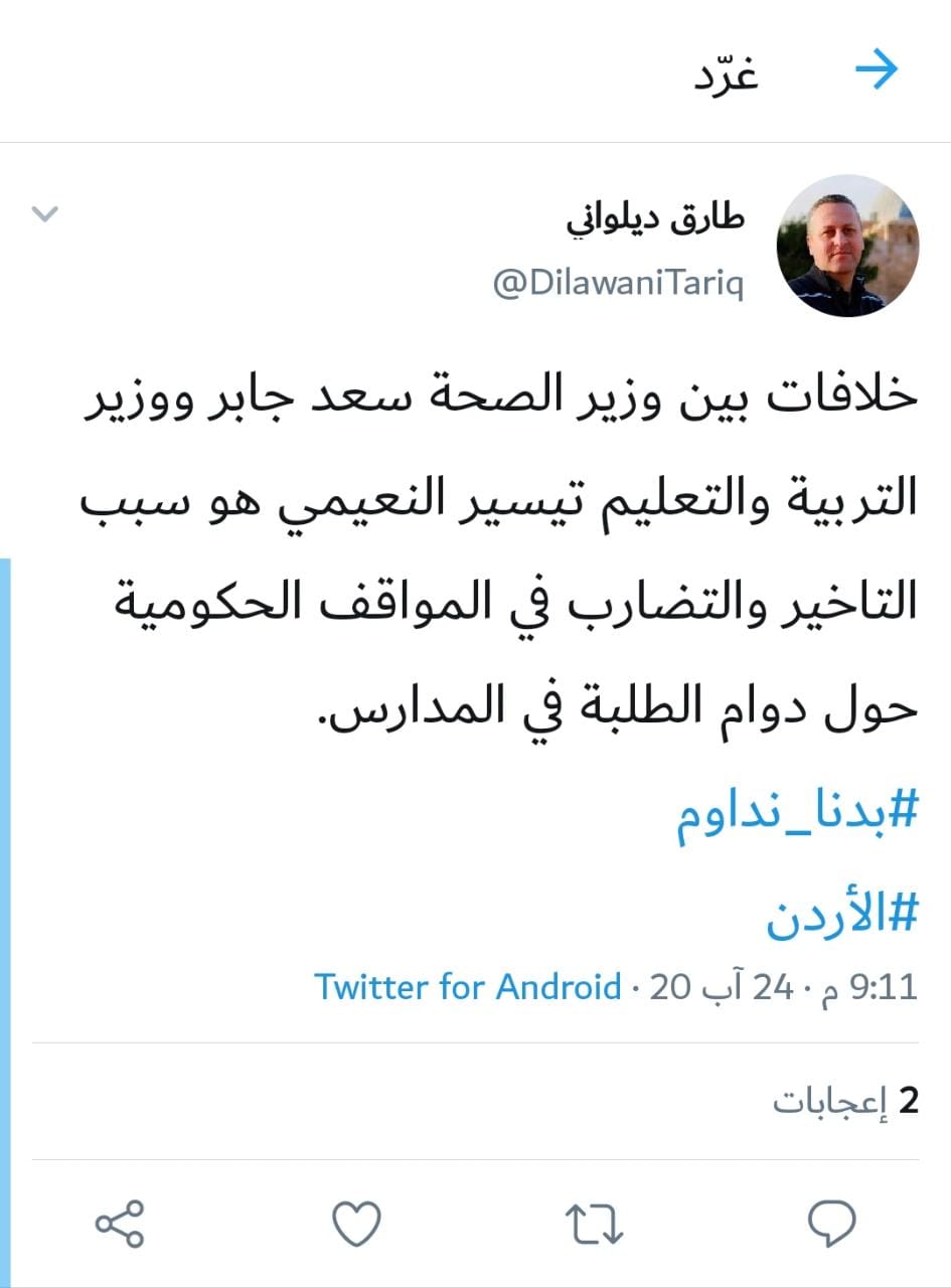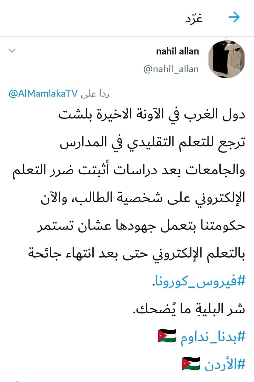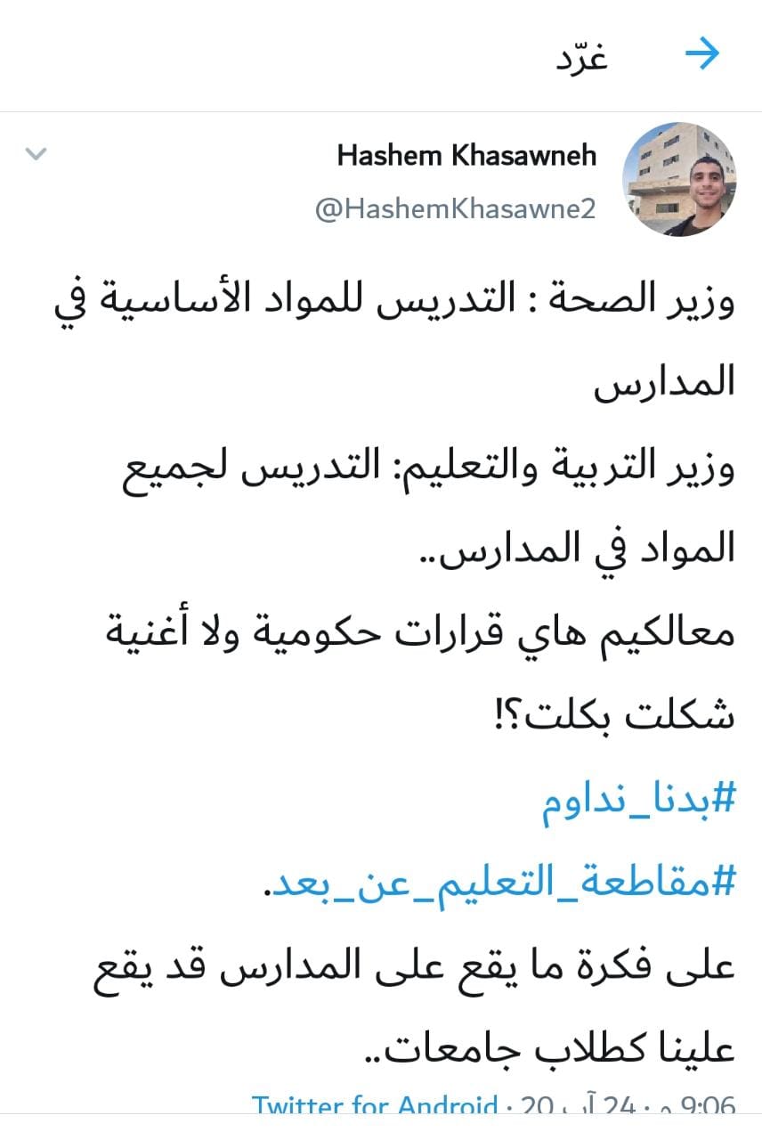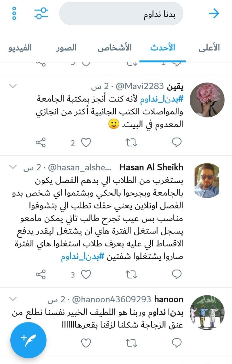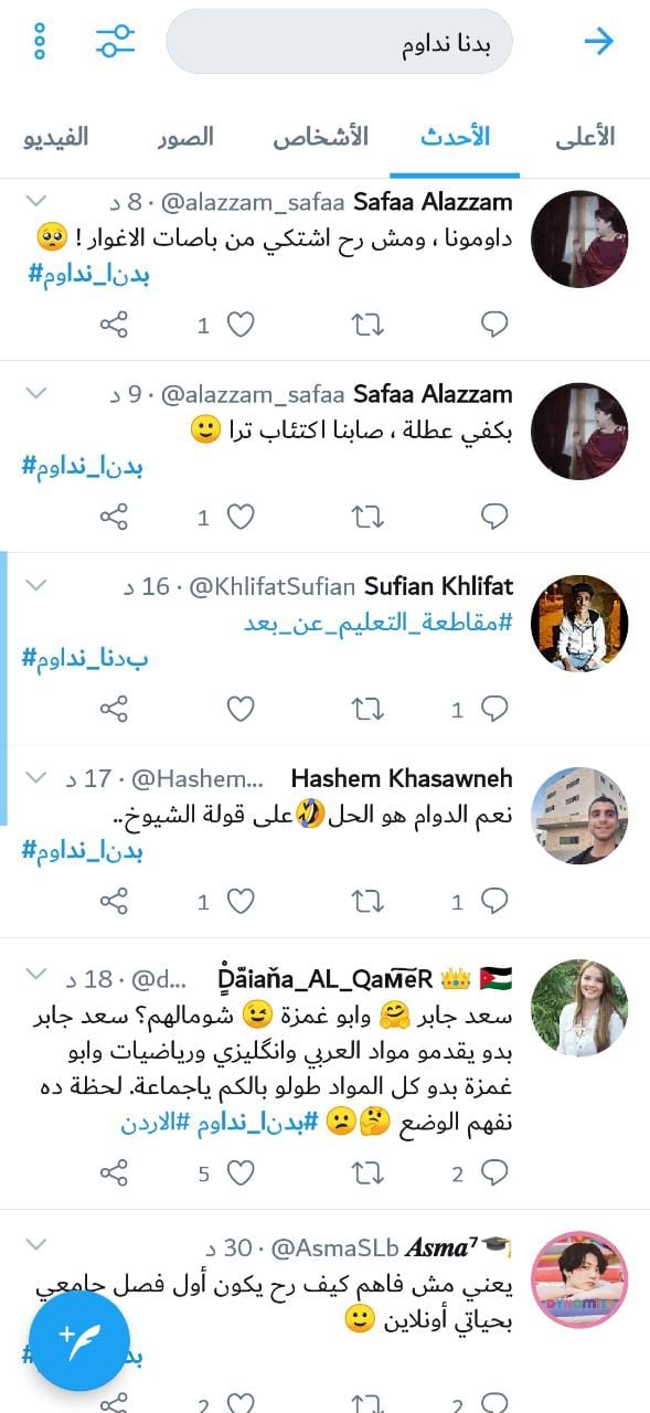 وتفاعلوا عبر وسم #بدنا_نداوم على مواقع التواصل الاجتماعي في الأردن، مطالبين بالرجوع إلى المدارس والجامعات نظرا للسلبيات الكبيرة التي خلقها التعلم الإلكتروني عن بعد.