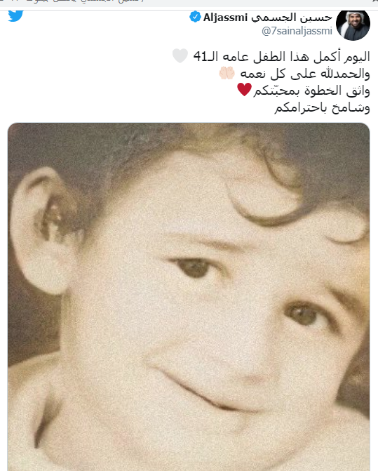 وبتلك المناسبة، شارك الجسمي جمهوره صورة نادرة له من مرحلة الطفولة، وكتب معها: "اليوم أكمل هذا الطفل عامه الـ41 والحمد لله على كل نعمه واثق الخطوة بمحبّتكم وشامخ باحترامكم".