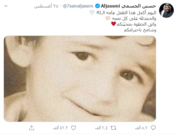 وعلق الجسمي على الصورة قائلا " اليوم أكمل هذا الطفل عامه الـ41 والحمدلله على كل نعمه".