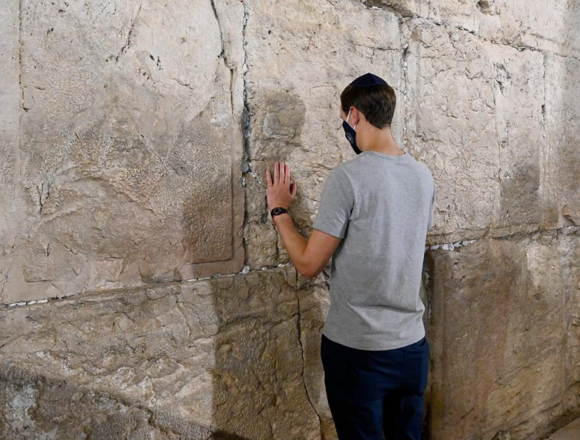 وأظهرت عدد من الصور جاريد كوشنير وهو يؤدي الصلوات، لوحده أمام حائط البراق، ويرتدي كمامة، وقبعة صغيرة على رأسه "الكيباه".
