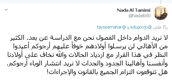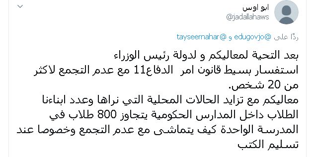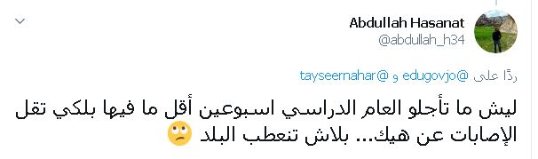 وتباينت ردات فعل الناشطين على مواقع التواصل الاجتماعي، فمنهم من استهزء في قرارات الحكومة واعتبرها قرارات غير منطقية خاصة مع نظام دوام الطلبة (فردي، زوجي)، ومنهم من طالب بتأجيل الفصل نظراً للوضع الوبائي الذي وصل اليه الأردن.