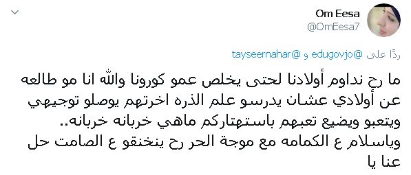 وأكد عدد من أولياء الأمور عدم رغبته في ارسال اولاده الى المدارس خوفاً من انتشار فيروس كورونا بين الطلاب، مطالبين بتطوير ورفع كفاءة نظام التعليم عن بعد حتى يكتفوا به.