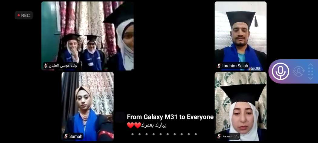 أحداث اليوم - اقامت هيئة الاغاثة الدولية حفل تخريج افتراضي على منصة زوم الاول من نوعه، للطلبة الناجحين والمتفوقين في امتحان الثانوية العامة من اللاجئين السوريين