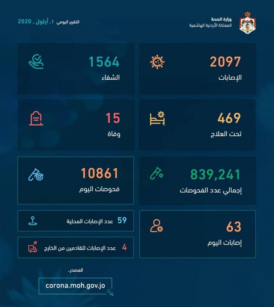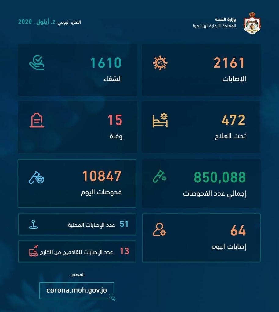 كما وصل عدد الإصابات الإجمالي الى 2161 منذ بداية الجائحة، الى جانب تسجيل 15 وفاة.