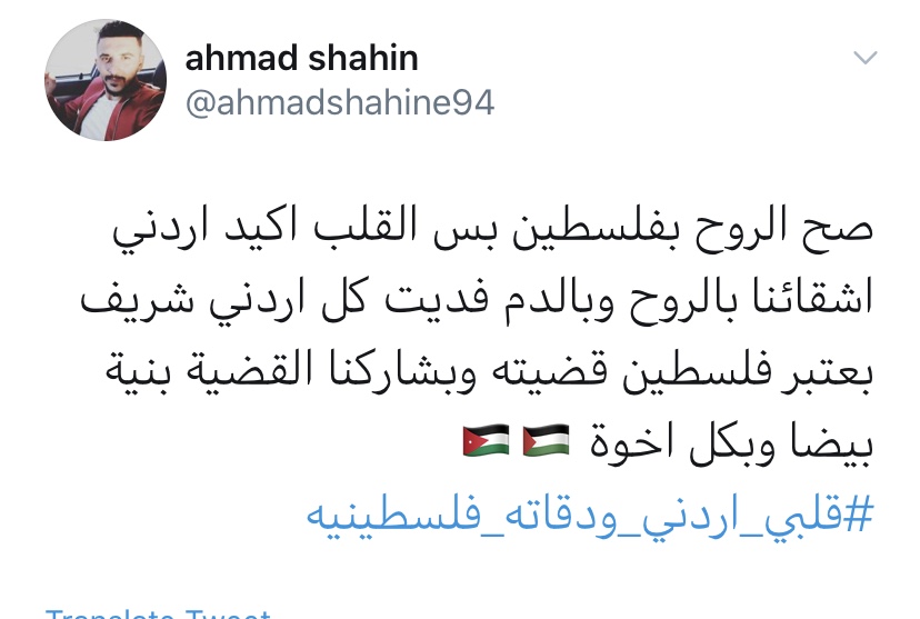 أحداث اليوم - فرح غيث - تصدر هاشتاغ قلبي أردني ودقاته فلسطينية قائمة الترند على موقع التواصل الاجتماعي " تويتر" في الأردن.