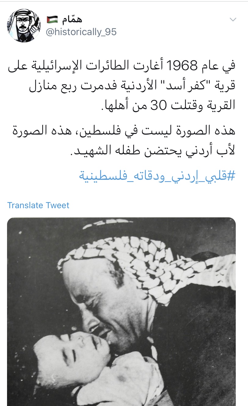 ونشر الناشطين صوراً استذكروا فيها مواقف بين الشعب الأردني والشعب الفلسطيني.