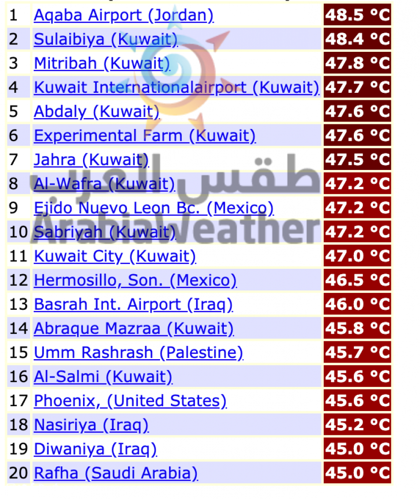 وبيّن الموقع أن تصنيف العقبة بهذا الترتيب لكون درجات الحرارة فيها تجاوزت كل الدول الخليجية بسابقة ستثنائية لم تحصل من قبل.