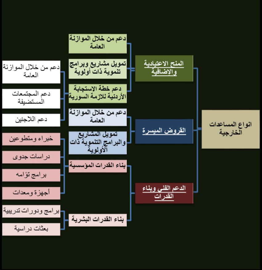 وتقسم المساعدات الخارجية إلى المنح الاعتيادية والإضافية والقروض الميسرة والدعم الفني وبناء القدرات.