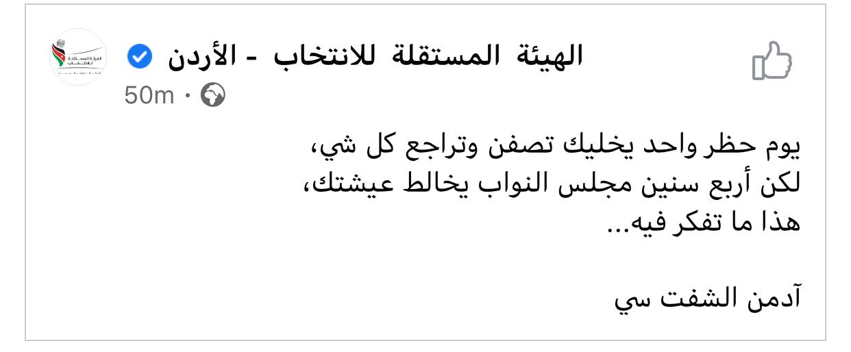 وجاء بالمنشور:" يوم حظر واحد يخليلك تصفن وتراجع كل شي، لكن اربع سنين مجلس النواب يخالط عيشتك هذا ما تفكر فيه..