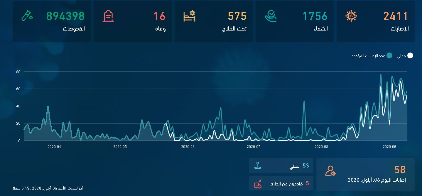 وبيّنت الوزارة، أنه وصل عدد الإصابات الإجمالي بفيروس كورونا منذ بداية الجائحة الى 2411 مصاباً، شفي منهم 1756 شخص.