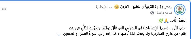 قالت وزارة التربية والتعليم، في منشور لها عبر فيسبوك، إن جميع الإصابات بفيروس كورونا المستجد التي سُجلت في المدارس وتم تعليق الدوام فيها وتحولت للتعلم عن بعد هي من خارج المدارس.