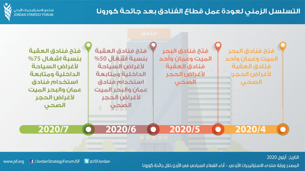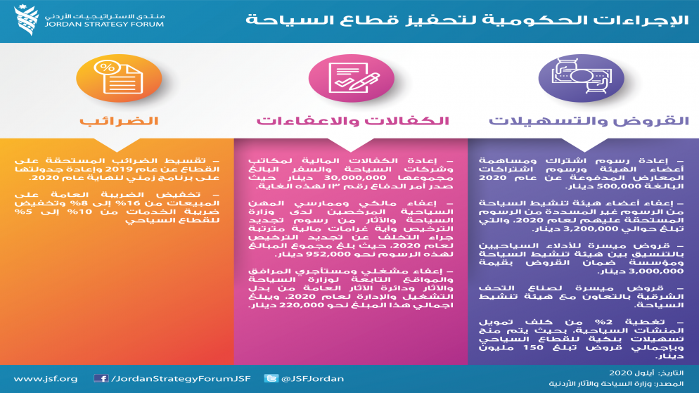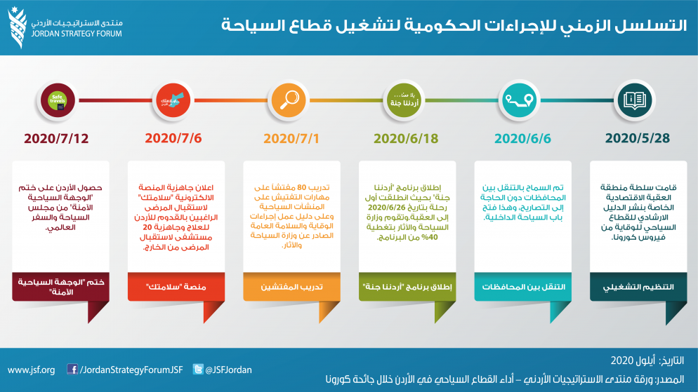 وأورد المنتدى في تقريره التسلسل الزمني للإجراءات التي اتخذتها الحكومة للشركات والعاملين في قطاع السياحة بعد فترة الإغلاق ضمن جهودها لإعادة إنعاش القطاع، والحد من الأثر الاقتصادي السلبي الذي أحدثته الجائحة، التي بدأت في شهر حزيران/ يونيو، السماح بالتنقل بين المحافظات دون الحاجة إلى التصاريح، والذي فتح بدوره باب السياحة الداخلية، وإطلاق برنامج "أردننا جنة" بحيث تقوم وزارة السياحة والآثار بتغطية 40% من البرنامج، ومن ثم تدريب 80 مفتشاً على مهارات التفتيش على المنشآت السياحية، وعلى دليل عمل إجراءات الوقاية والسلامة العامة الصادر عن وزارة السياحة والآثار في شهر تموز، وإطلاق منصة "سلامتك" لاستقبال المرضى الراغبين بالقدوم للأردن للعلاج، وجاهزية 20 مستشفى لاستقبال المرضى من الخارج، وحصول الأردن على ختم "الوجهة السياحية الآمنة" من مجلس السياحة والسفر العالمي.