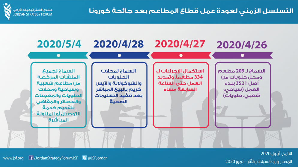 وفي قطاع المطاعم السياحية، سمحت الحكومة بالعمل بداية عن طريق خدمة التوصيل المنزلي، ومن ثم السماح لها بفتح أبوابها، بشرط التقيد بتعليمات التباعد الاجتماعي، وشروط الصحة والسلامة في ظل الجائحة.