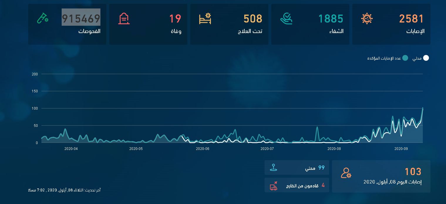 أحداث اليوم - سُجل في المملكة أمس الثلاثاء 103 اصابات جديدة بفيروس كورونا، لتكون بذلك الاحصائية اليومية الاعلى باصابات كورونا منذ بدء الجائحة في آذار الماضي.