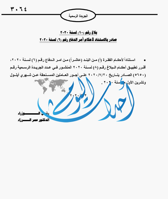 أصدر رئيس الوزراء عمر الرزاز بلاغاً لتنظيم أجور شهري ايلول وتشرين الاول للعاملين في القطاع الخاص.