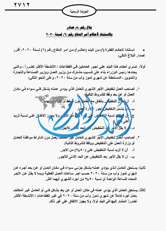 وجاء في البلاغ الذي نشر بالجريدة الرسمية أنه يسمح للقطاعات الأكثر تضرراً وباتفاق مع العامل تخفيض الأجر الشهري بنسبة 20% لشهري ايلول وتشرين أول .