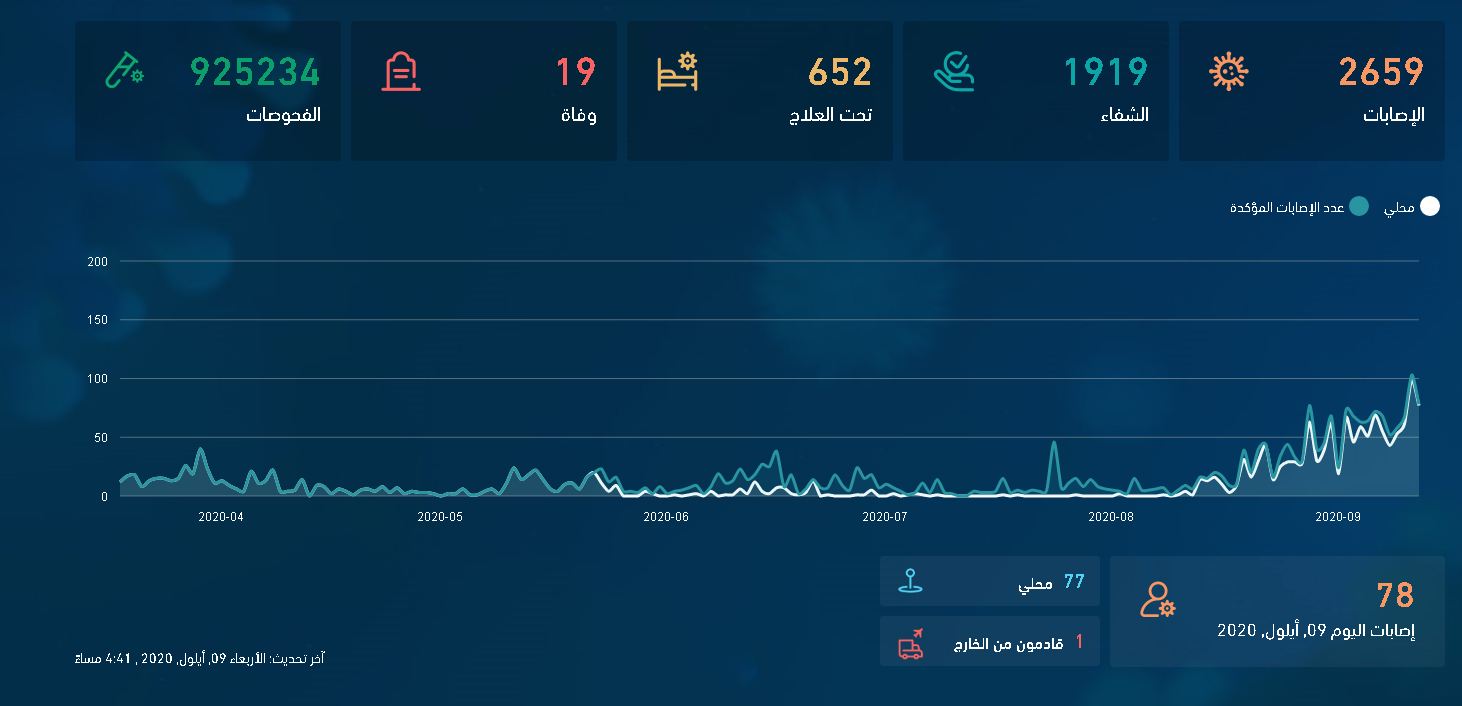 وبينت ارقام وزارة الصحة الرسمية التي اطلع عليها" أحداث اليوم" أن عدد المصابين التراكمي منذ بداية الجائحة حتى أمس الاربعاء وصل إلى 2659 مصاباً، شفي منهم 1919 مصاباً.