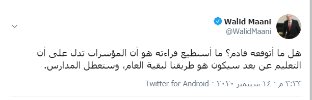 جاء ذلك في تغريدة له عبر موقع التويتر، رجح فيها اتخاذ قرار بتعطيل المدارس.
