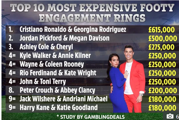 ونشرت "ذا صن" نقلا عن أحد المواقع المتخصصة، قائمة بأغلى خواتم الخطوبة في عالم كرة القدم، حيث جاء ترتيب اللاعبين العشرة الأوائل على الشكل التالي: