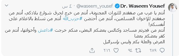 وقال يوسف في سلسلة تغريدات له عبر حسابه على تويتر: "أنتم يا عرب من صفقتم للثورات المجنونة، أنتم من خرج لحرق شوارع بلادكم، أنتم من صفقتم للإخوان المسلمين، أنتم من أحتضن حزب الله أنتم من تسلط بالإعلام على أنفسكم".