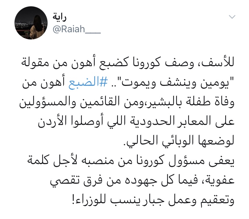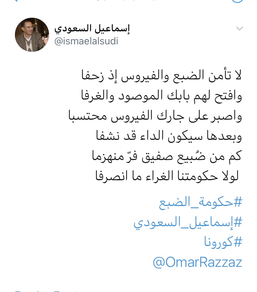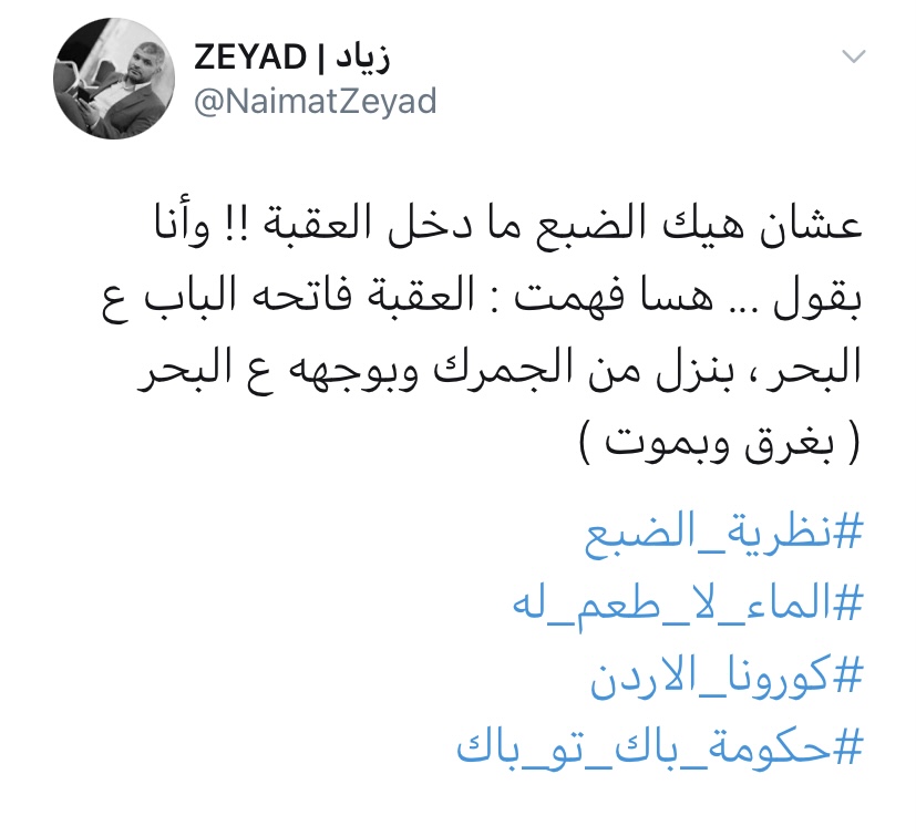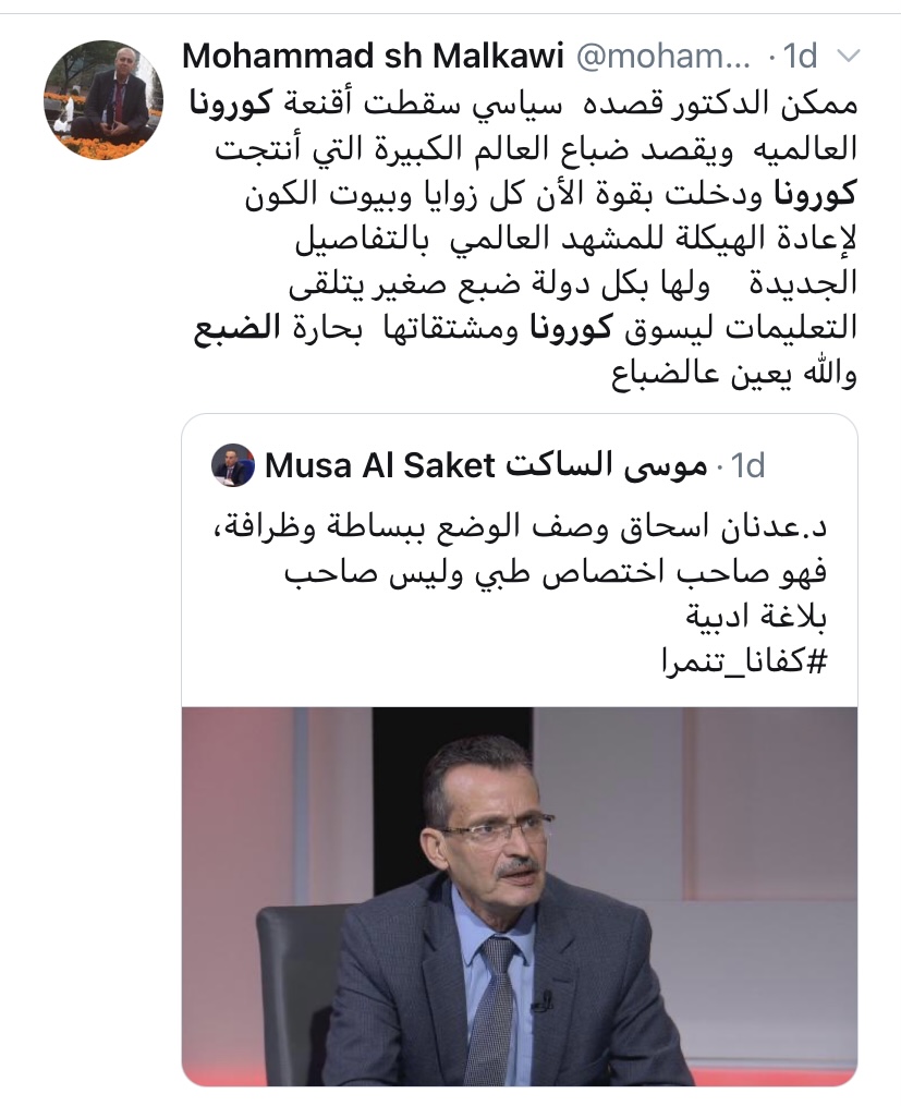 وأضاف: "طبعا بخلي مفتوح، حتى يغادر الضبع، وهذا مثال لوضعنا في كورونا نفتح المطارات والبلاد حتى تغادر".