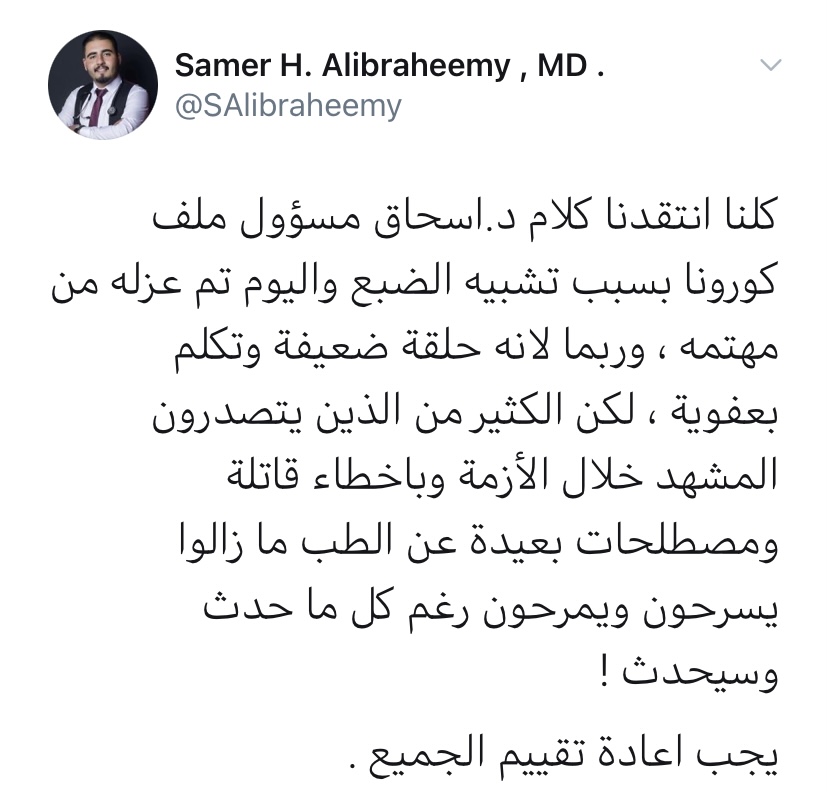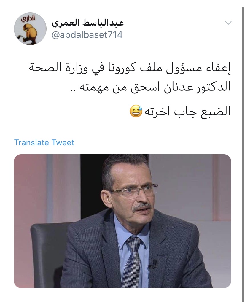 أحداث اليوم - فرح غيث - اثار قرار اعفاء مسؤول ملف كورونا السابق في وزارة الصحة الدكتور عدنان اسحق مواقع التواصل الإجتماعي بشكلٍ كبير.