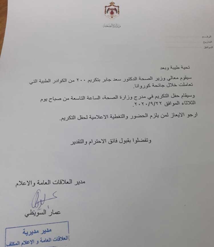 أعلن وزير الصحة الدكتور سعد جابر عن احتفال يقام داخل الوزارة يجمع 200 طبيب لتكريمهم على جهودهم خلال جائحة كورونا.