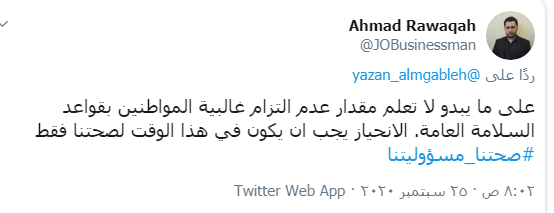 بعد أن سجل الأردن خلال الشهر الماضي ارتفاعاً غير مسبوق في الإصابات بفيروس كورونا المستجد، دشن نشطاء وسم #صحتنا_مسؤوليتنا عبر مواقع التواصل الإجتماعي، تاكيداً منهم على أن المواطن هو مسؤول وشريك في الحد من ارتفاع أعداد الإصابات من خلال الإلتزام بالتعليمات الصحة.