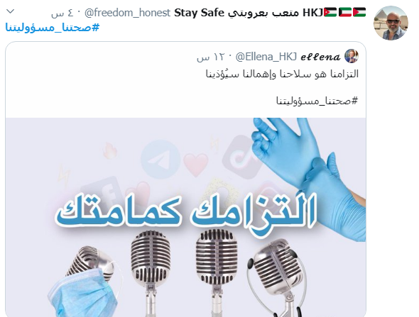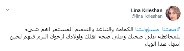 وشارك العشرات منشوراتهم عبر الوسم، مؤدين على اأن إهمال اجراءات السلامة العامة، والتباعد الجسدي والإجتماعي وعدم ارتداء الكمامات سيسبب الأذى للجميع، مشيرين إلى أن الالتزام هو سلاح القضاء على المرض.