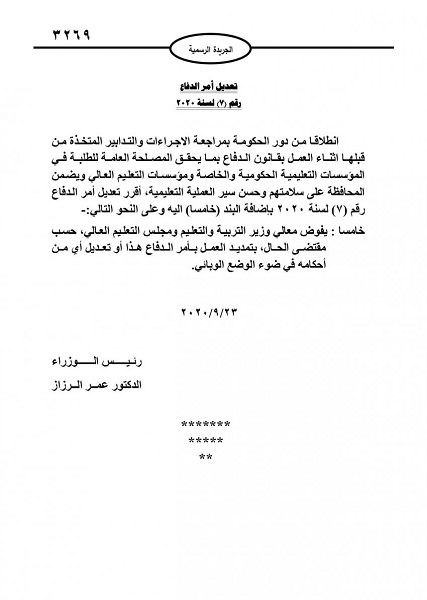 يفوض معالي وزير التربية والتعليم ومجلس التعليم العالي حسب مقتضى الحال بتمديد العمل بأمر الدفاع هذا أو تعديل أي من أحكامه بمقتضى الوضع الوبائي وذلك وفق الجريدة الرسمية.