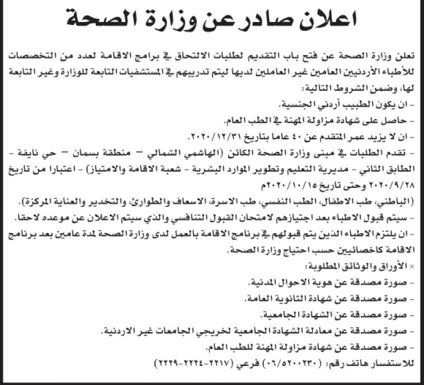 أحداث اليوم - أعلنت وزارة الصحة، اليوم الاثنين، عن فتح باب التقديم لطلبات الالتحاق في برامج الاقامة.وتاليا الاعلان: