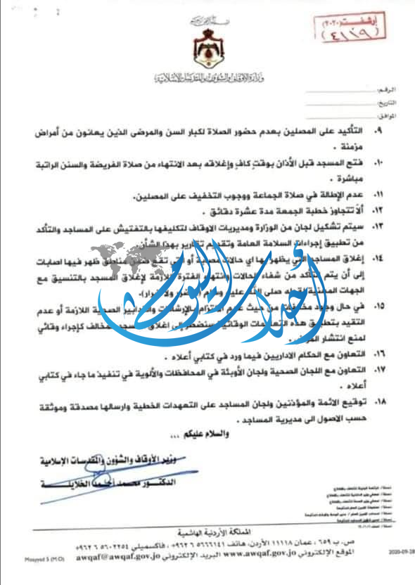 أحداث اليوم - ياسر شطناوي - عمم وزير الأوقاف والشؤون والمقدسات الإسلامية محمد الخلايلة على مدراء الأوقاف بضرورة اتخاذ الإجراءات الوقائية والصحية خلال فتح المساجد يوم الجمعة القادم وباقي الايام.