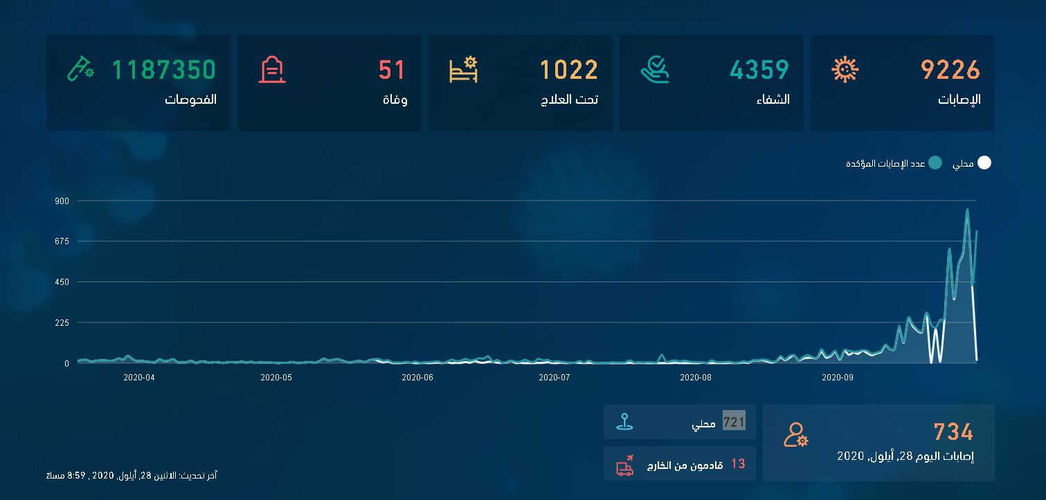 واوضحت الأرقام أن العدد الإجمالي للاصابات المسجلة منذ بداية الجائحة تجاوز 9 آلاف أصابة، ليصل إلى 9226.