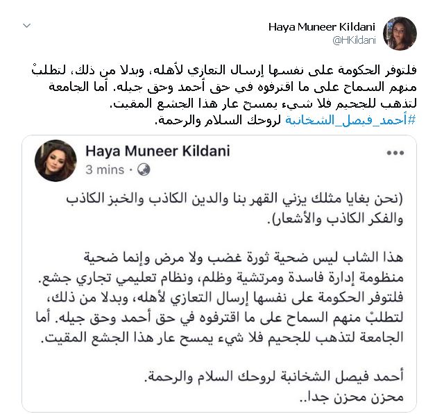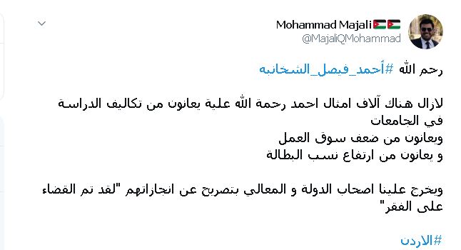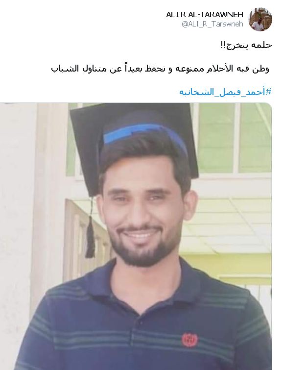 واشاروا إلى أن احمد ظُلم ودفع حياته ثمن الجشع والحرمان وسلطة راس المال والخصخصة، مضيفين أن عدد كبير من الطلبة الأردنيين يعيشون ذات المعاناة.