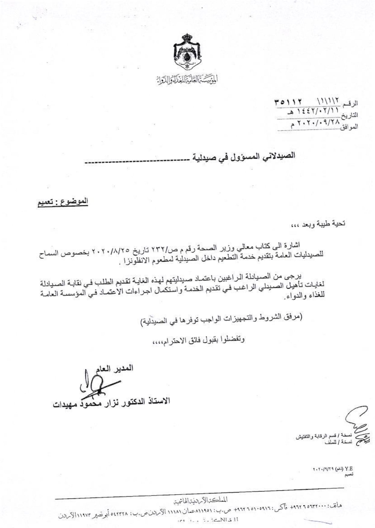 حضرة الزميلات والزملاء الكرام أرفق كتاب المؤسسة العامة للغذاء والدواء بخصوص السماح للصيدليات العامة بتقديم خدمة...