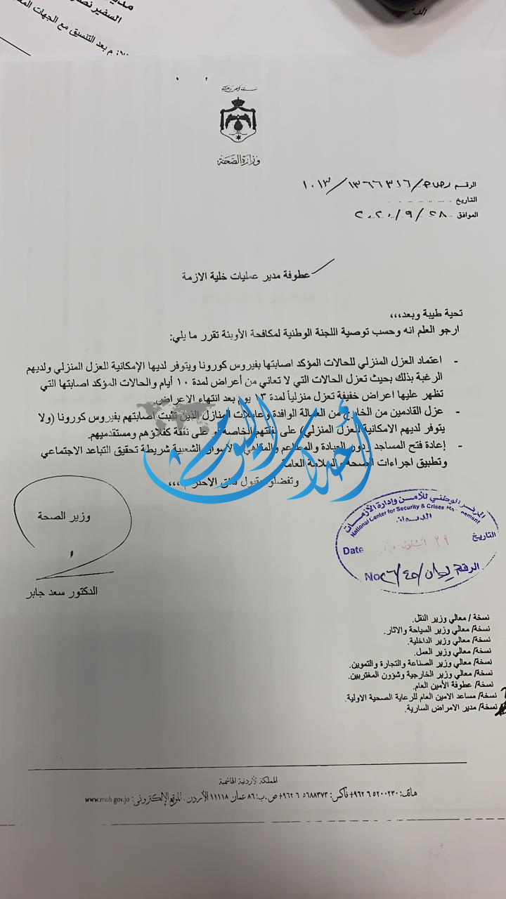 وجاء ذلك في كاتب من وزارة الصحة الى إدارة الأزمات وبتوصية من اللجنة الوطنية للاوبئة.