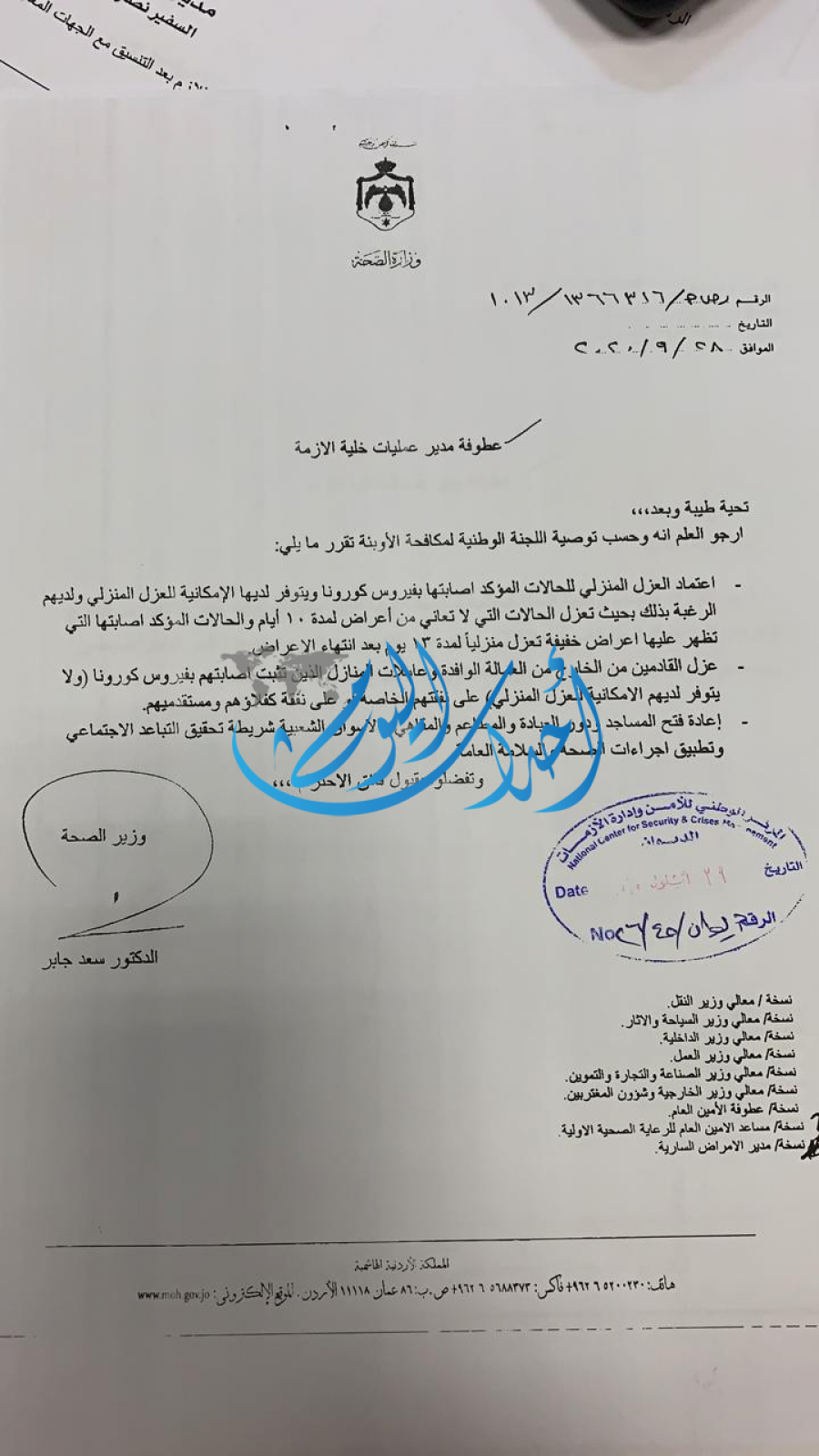 وبيّن كتاب رسمي من وزارة الصحة موجه لخلية الأزمة، اطلع عليه احداث اليوم، أنه سيتم عزل الحالات التي لا تعاني من اعراض لمدة 10 ايام، والحالات المؤكد اصابتها وتظهر عليها اعراض خفيفة تعزل لمدة 13 يوماً بعد انتهاء الأعراض.