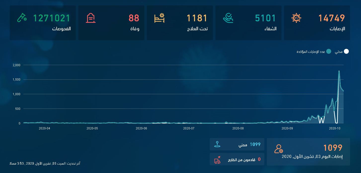 كما بلغ عدد الفحوصات المخبرية التراكمي منذ بداية الجائحة 1271021 فحصاً مخبرياً اجريت في كل ارجاء المملكة.