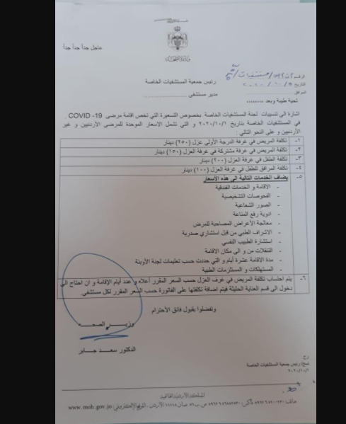 وقال مدير مديرية ترخيص المهن والمؤسسات في الوزارة الدكتور ناصر الخشمان، إن الأسعار تشمل خدمات الرعاية والاستشارات الطبية اللازمة، وليس الخدمات الفندقية فقط.