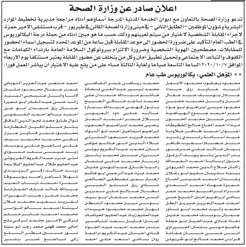 أحداث اليوم - دعت وزارة الصحة بالتعاون مع ديوان الخدمة المدنية المدرجة أسماؤهم مراجعة مديرية تخطيط الموارد البشرية وشؤون الموظفين في مبنى الوزارة.وتاليا الأسماء
