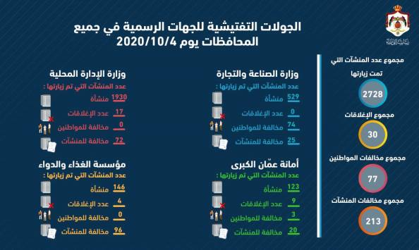 وقالت الحكومة، إن أبرز مخرجات جولات الرقابة ليوم الأحد، تمثلت بزيارة 2728 منشأة، وإغلاق 30 منها، إضافة إلى مخالفة 77 مواطنا، و213 منشأة.